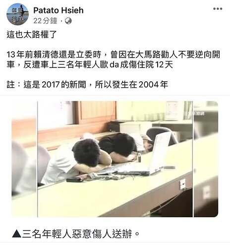 2004年時,賴清德勸人不要逆向駕駛,逆向駕駛很危險,被規勸的駕駛者不爽,call 人來打賴清德。