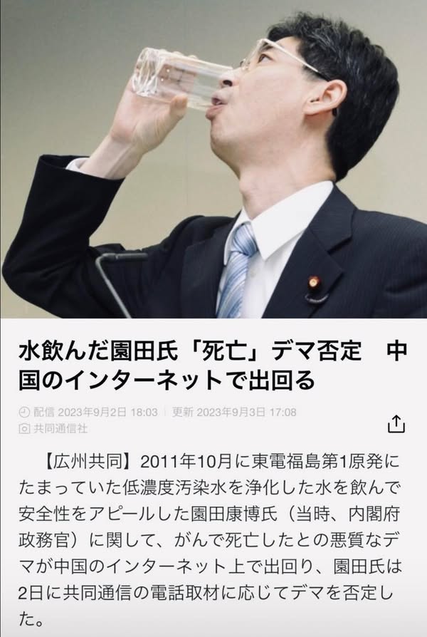 昨天(2023年9月2日),原田接受了「共同通信社」的電話採訪。他表示,「自己當年公開喝下核處理水,沒想到如今成為中國造謠的來源。為此,要向311災民和福島民眾致歉」。