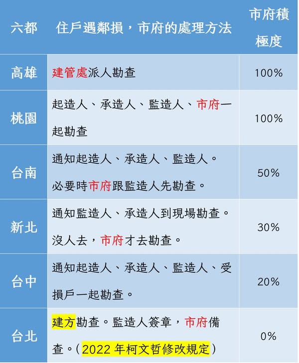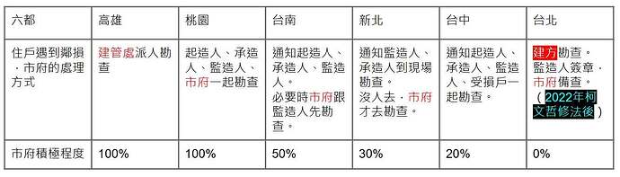 只有 台北 創出了「建方勘察」,也就是 100% 建商內部人員去判斷,完美實現了「球員兼裁判」。