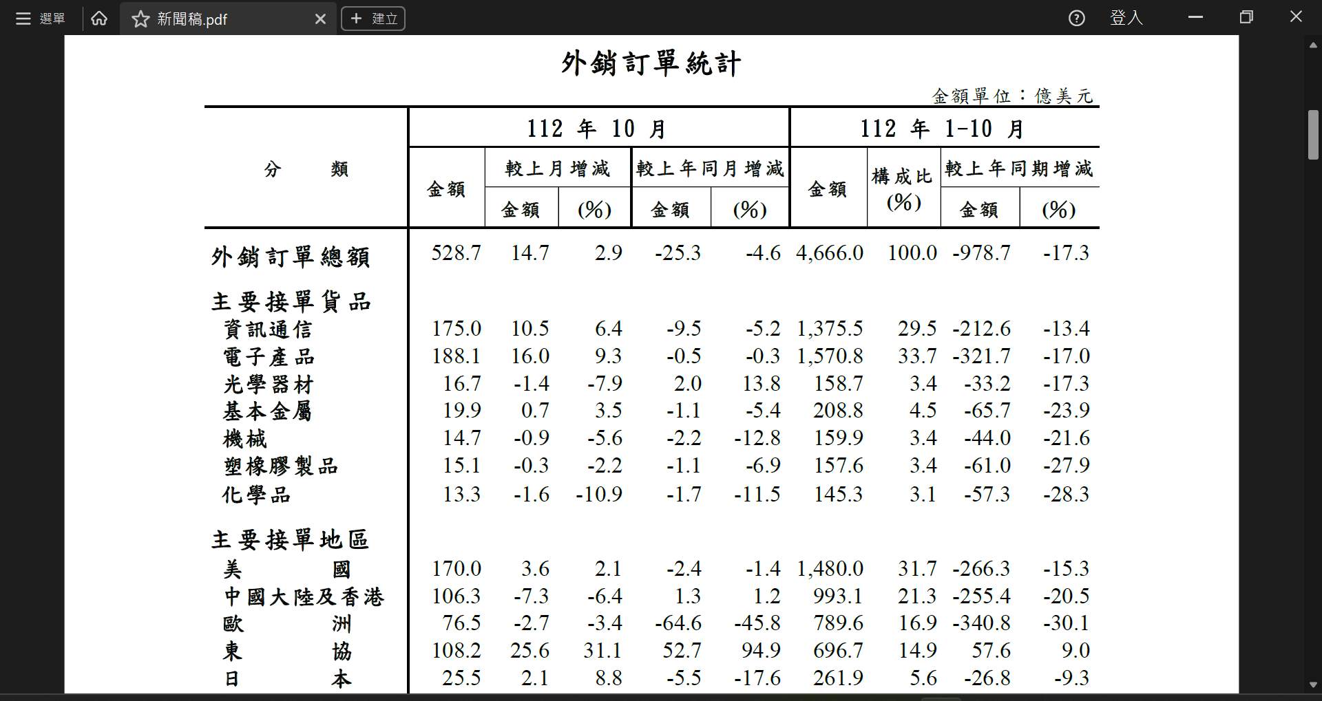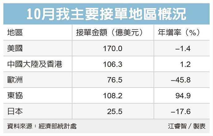 | 接單地區 | 金額(億美元) | 較上月增減金額 | 較上月增減(%) | 較上年同月增減金額 | 較上年同月增減(%) |