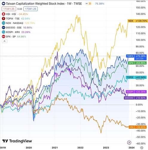 2016~2023 東亞主要股市漲幅(來源:紀路臺灣)