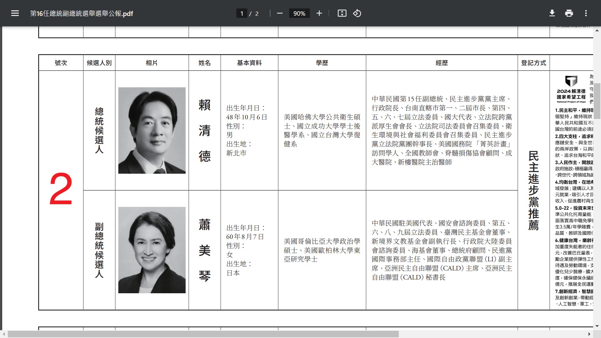 第16任總統副總統選舉選舉公報