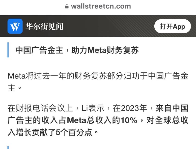2023年,來自中國廣告主的收入佔 Meta總收入的10%,對全球總收入增長貢獻了 5個百分點。