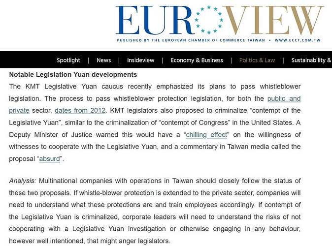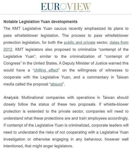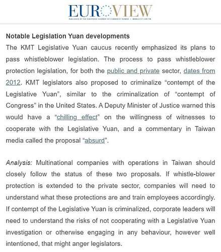 4月23日:歐洲在台商會發佈「台灣政治評論」(英文):提醒會員注意藐視國會罪的修法。若通過本罪,若觸怒(anger)立法委員,不論本意為何,有面臨刑責的風險。