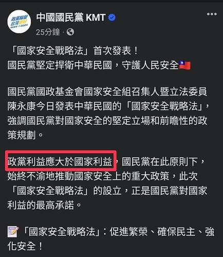 國民黨臉書發布一篇關於「國家安全戰略法」的貼文,表示要促進繁榮、確保民主、強化安全。(5月13日,該貼文已刪除)