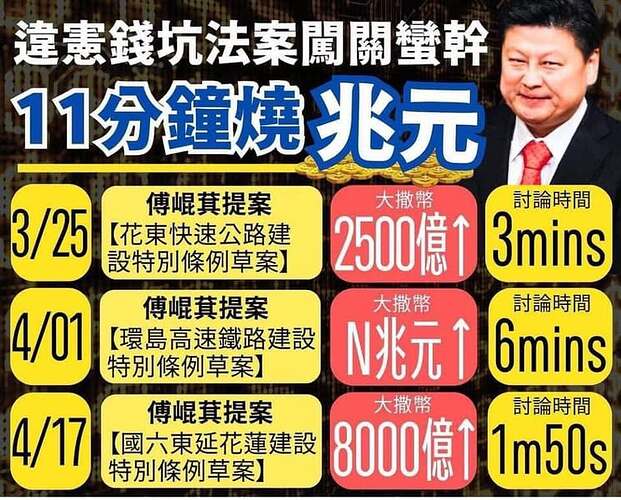 吳思瑤:傅崐萁所提的花東快、環島高鐵、國道6號東延花蓮建設特別條例草案等 3大錢坑法案,金額高達新台幣 N兆元,但在委員會審查時總共花了 10分 50秒。
