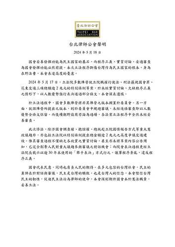 國會代表民意,同時也肩負人民的期待。在多元包容的台灣社會,民主的真諦在於對話與審議,民主是台灣的驕傲,也是台灣人的信念,本會堅信台灣民主的韌性,促進民主法治為律師的使命,本會深刻期許國會本於憲法職責,妥善立法。