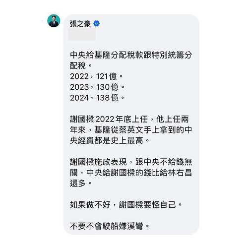 這不是謝的功勞,而是這幾年民進黨執政,經濟發展中央財政變更好,給基隆市的錢多很多。