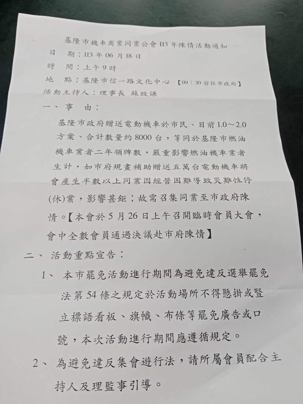 基隆市機車同業公會,因為謝國樑市府預計送出 5 萬台電動機車,將導致基隆市半數以上的機車行經營困難而災難性休業,計畫到基隆市政府抗議。