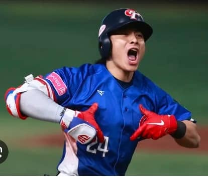 陳傑憲在第 5 局開轟繞壘時,以隊友潘傑楷日前在胸前比劃「Taiwan」手勢,向全世界介紹「Team Taiwan」