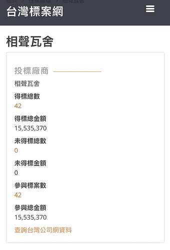 焦糖哥哥在 台灣標案網 查詢「相聲瓦舍」,至少有 42 個標案,共計 1553 萬。
