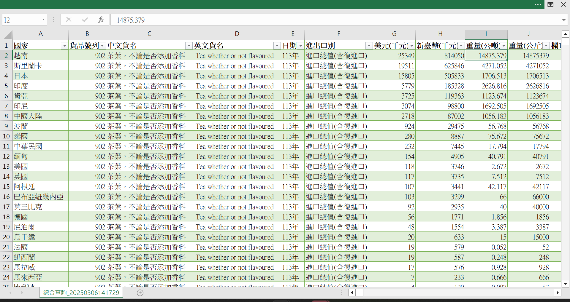 實際到海關查詢(茶葉貨號為 902),2024年由越南進口的總茶葉量為 14,875 公噸,並非原消息所示之數目(17 萬噸)。