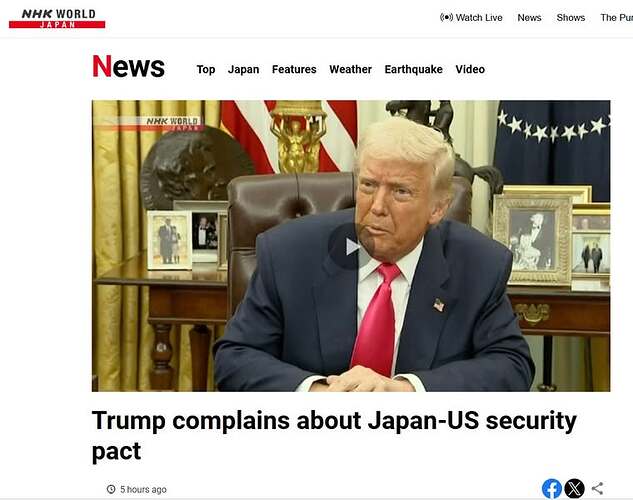 川普抱怨美日安保條約,說這份條約規定美國必需保護日本,日本卻不用保護美國,並不平等。