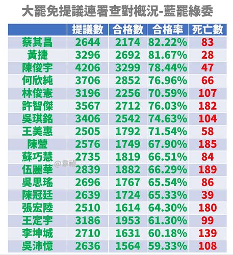| 提議數 | 合格數 | 合格率 | 死亡數 | |