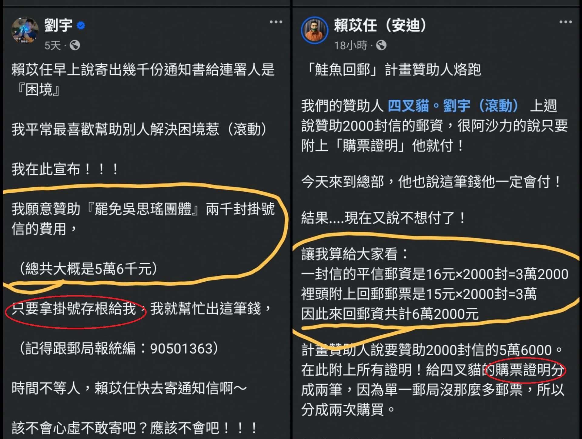 - 劉宇:贊助「2000 封掛號信」的費用,強調是「掛號信」。