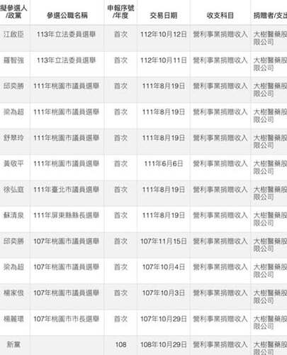 原來大樹藥局捐獻這麼多個爭議性國民黨參選人與新黨政治獻金。
