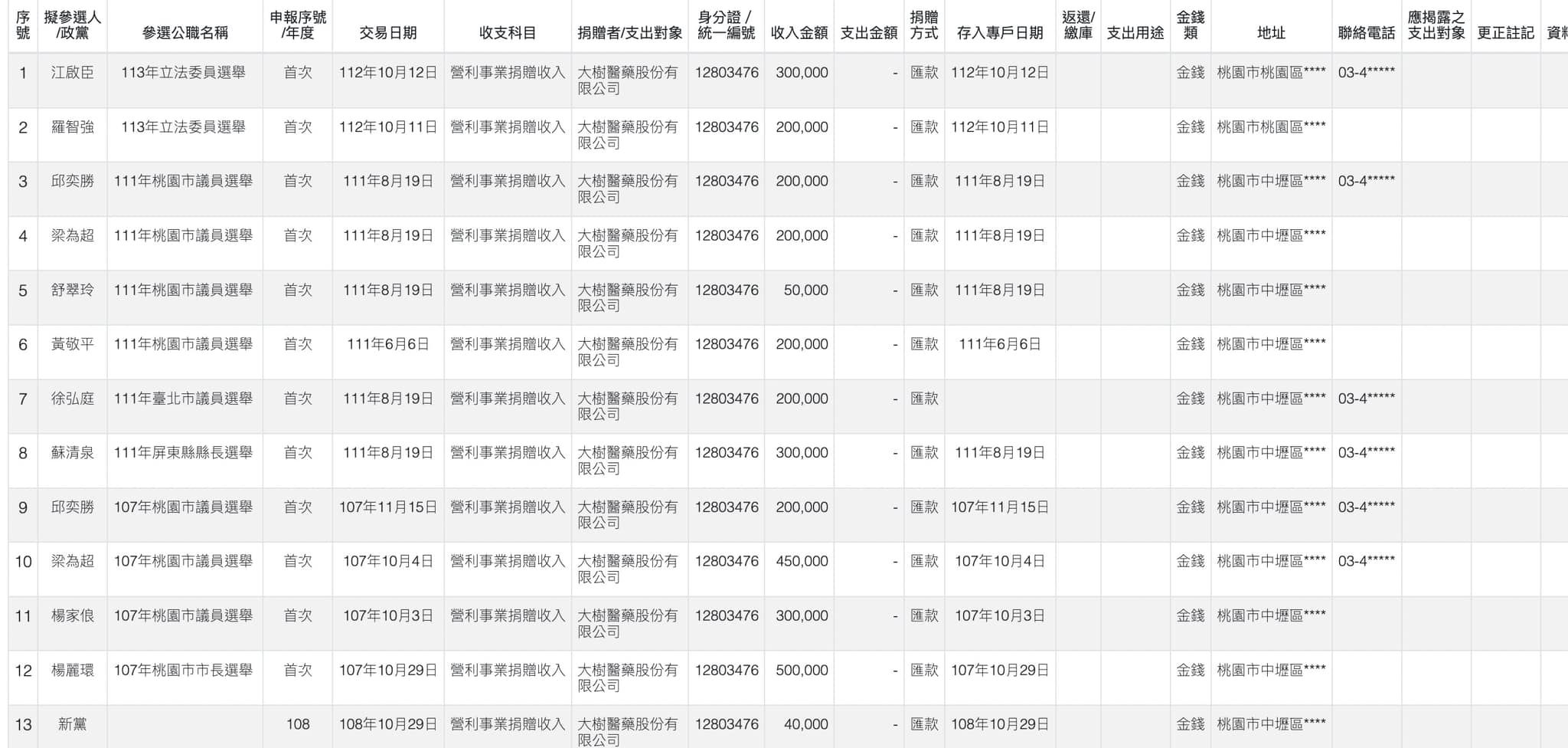 | 12 | 楊麗環 | 107年桃園市市長選舉 | 107年10月29日 | 大樹醫藥股份有限公司 | 12803476 | 500,000 |