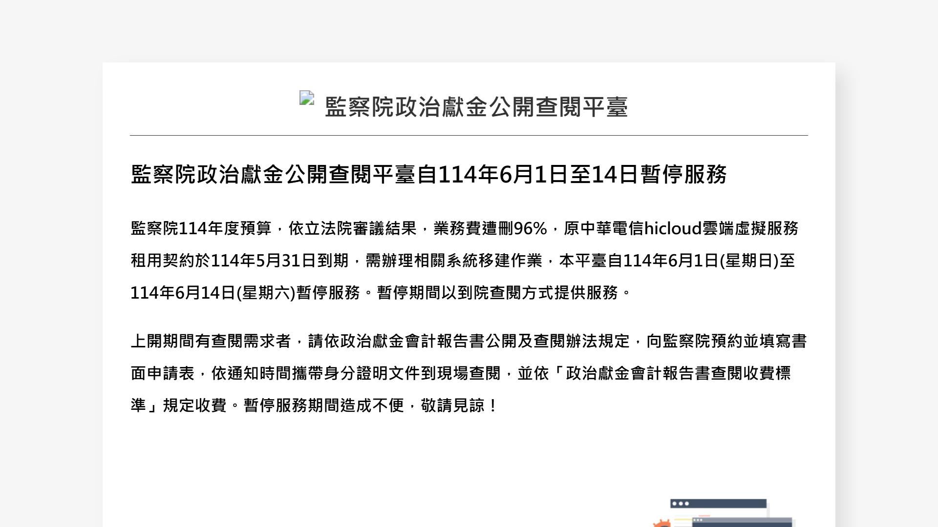 ▌ 政治獻金查閱平臺 暫停服務