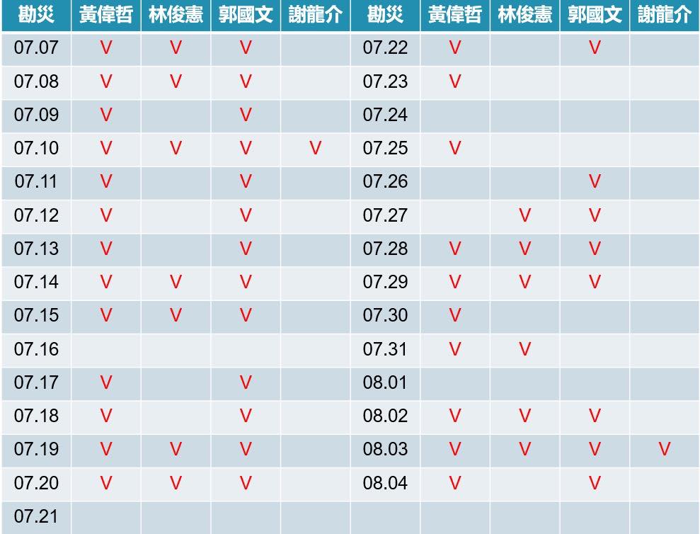 林俊憲,7.07-8.04共29天,出現在災區13天。(7.09、7.11、7.23、7.24、7.25、8.01在立院爭取災後補助),共計19天。
